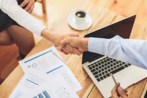 Group of coworkers having discussion during meeting