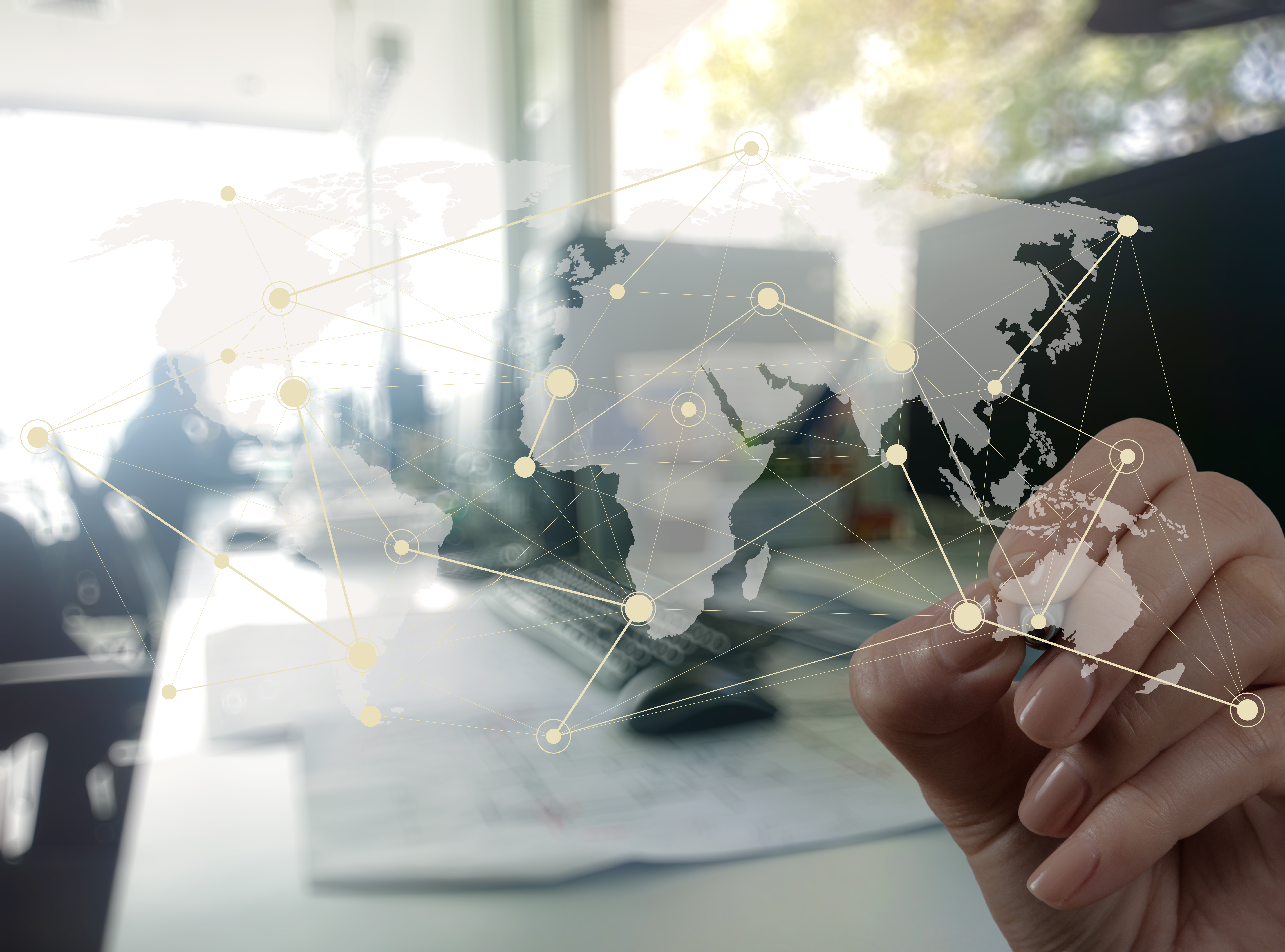 Double exposure of businessman working with new modern computer